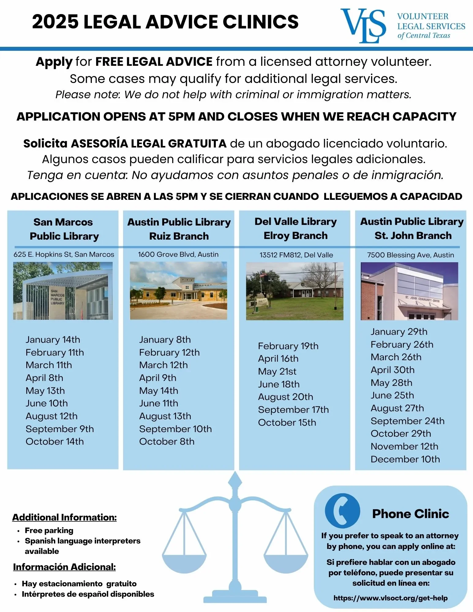 How: Clients can walk into the clinic during scheduled hours or apply online through VLS. Spanish-speaking interpreters are available, and consultations are conducted in a welcoming, accessible environment. Our attorneys volunteer to review cases, provide legal guidance, and connect individuals with additional resources.